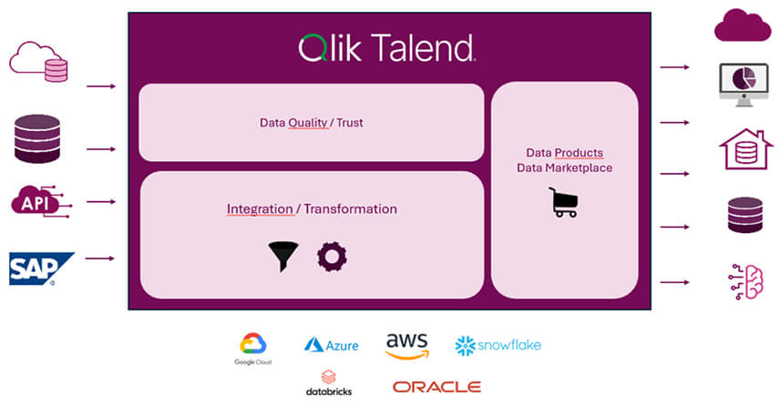 - Confiance dans les données : Qlik Talend Cloud propose des fonctionnalités unifiées de gestion de la qualité et d’intégration des données, lui permettant de devenir la « Single Source of Trust » de l’entreprise.