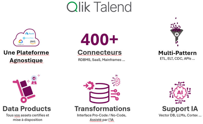 Cette solution s’inscrit dans l’offre complète « Qlik Cloud », qui intègre non seulement cette offre Qlik Talend Cloud pour la partie Intégration, mais aussi Qlik Analytics pour la partie analyse de données.