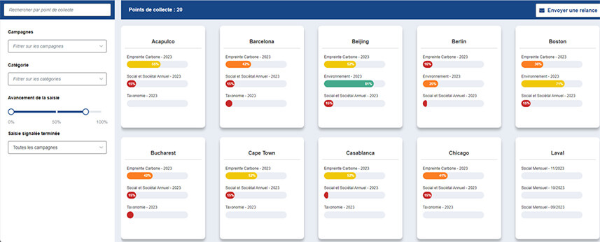 - Collecte multi-source : intégration automatique de données internes et externes à différents niveaux (BU, pays, site, etc.)