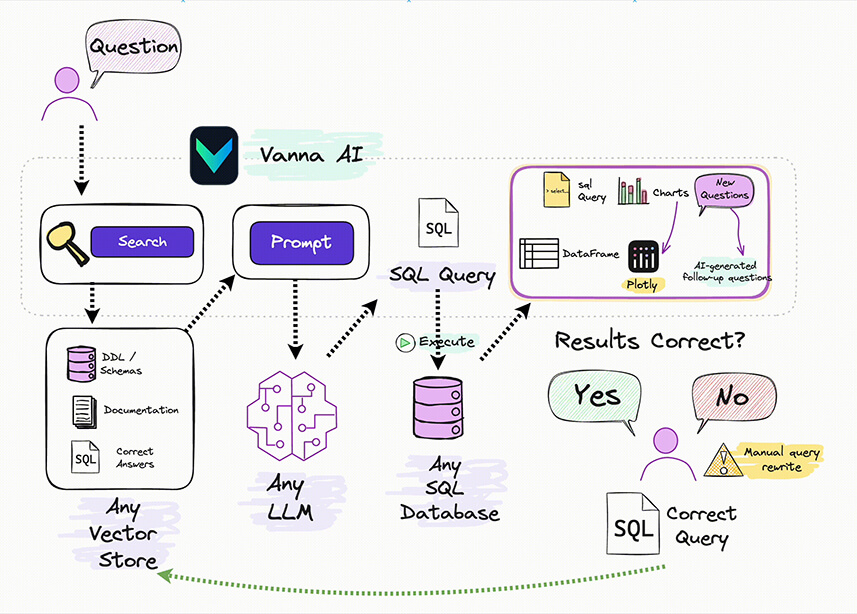 Vanna est un package Python qui utilise le RAG (Retrieval Augmented Generation) pour vous générer des requêtes SQL précises pour votre base de données en utilisant un modèle d’IA Générative (LLM : Large Langage Model). . Vanna est aussi capable d’interpréter le résultat de la requête. Il peut répondre sous forme de phrases, graphiques, tableaux, etc.