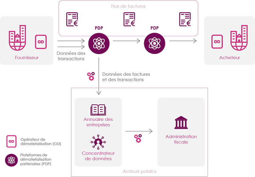 Le schéma suivant décrit le fonctionnement du circuit de dématérialisation de la facture électronique (l'utilisation d'un opérateur de dématérialisation étant optionnel) :